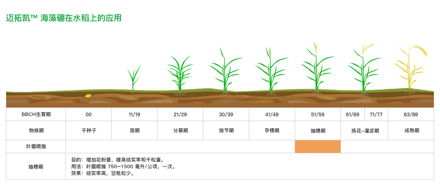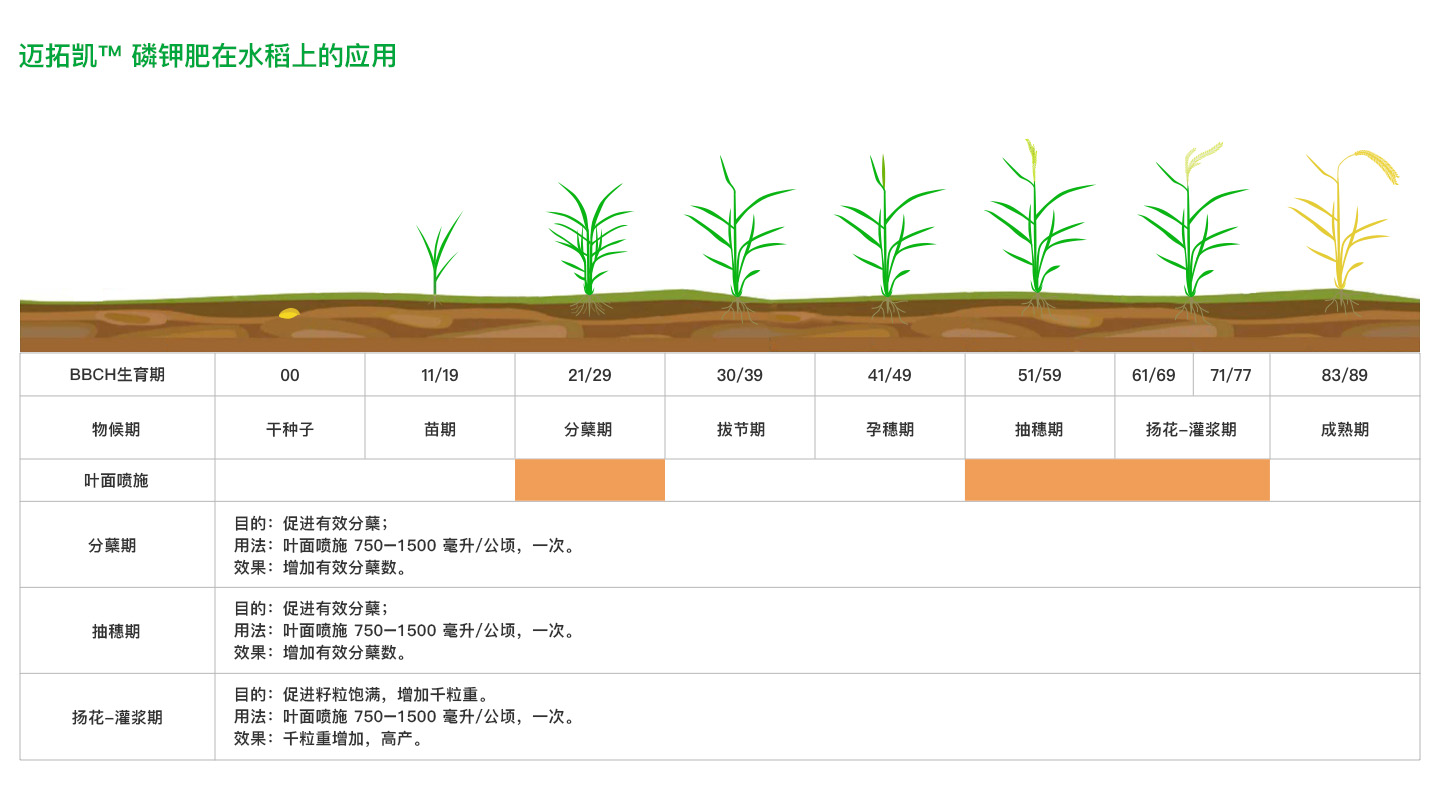 迈拓凯:通过植物营养和生物活化技术,支持水稻种植管理的各个生长阶段,增强植物活力,提高产量。